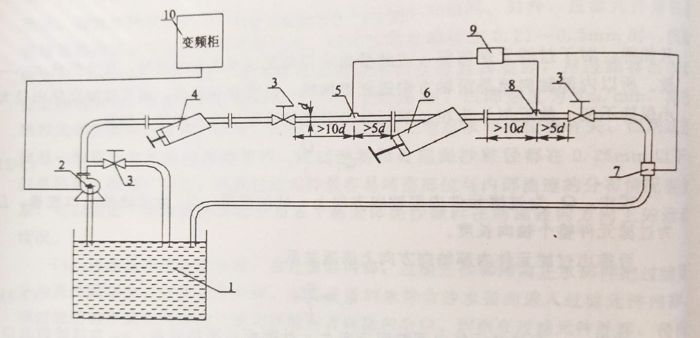 其中變頻裝置能夠保證連續(xù)穩(wěn)定地提供壓力水源,并能根據(jù)需要調(diào)節(jié)不同的流量檔次,保證在管路中水流保持恒定流狀態(tài)。為了消除水流脈動的影響,測壓力孔位置距上游干擾源不得小于10倍管內(nèi)徑,距下游干擾源不得小于5倍管內(nèi)徑。蓄水池容積21m³,并配有攪拌機構(gòu),能夠保證含沙水試驗中,泥沙濃度基本保持恒定。